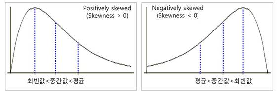 ② 왜도 값이 0인 경우에 정규분포와 유사한 모습으로 평균, 중앙값, 최빈값이 모두 같다.