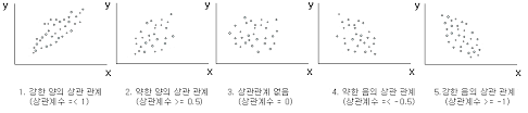 ③ 상관계수는 -1과 1사의 값을 가지며 선형성 정도를 보여줌