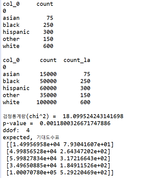 # 실습) 국가전체와 지역에 대한 인종 간 인원수로 독립성 검정 실습