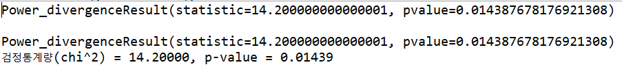 # statistic(검정통계량)=14.200000000000001, pvalue=0.014387678176921308