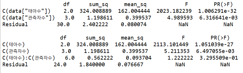 i. 모델생성: model = ols('종속변수컬럼~C(독립변수컬럼1) + C(독립변수컬럼2) + C(독립변수컬럼1):C(독립변수컬럼2)', DataFrame).fit()