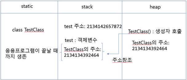 test = TestClass() #생성자 호출된 후 객체 생성(instance) - test변수가 주소를 기억함