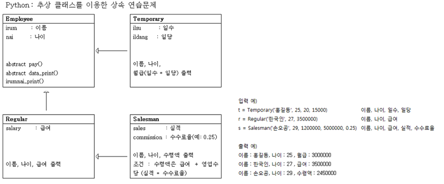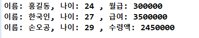 t = Temporary('홍길동',24,20,15000) #생성자를 부르면서 irum, nai, ilsu, ildang를 입력하니깐 Temporary클래스에도 이런 것을 다 받을 수 있는 생성자를 선언해야함