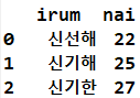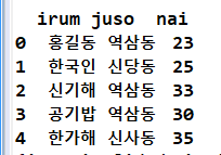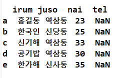 frame2 = DataFrame(data, columns=['irum', 'juso', 'nai', 'tel'], index = ['a', 'b', 'c', 'd', 'e'])
