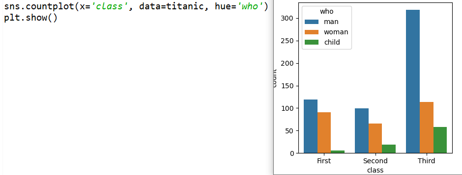 ex) hue = ‘who’: data의 사람 카테고리로 지정