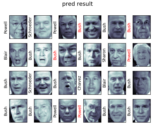 axi.set_ylabel(faces.target_names[pred[i]].split()[-1], color='black' if pred[i] == y_test[i] else 'red')