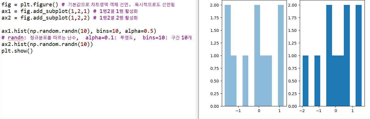 3) hist(data, bins=n, alpha=m): 히스토그램