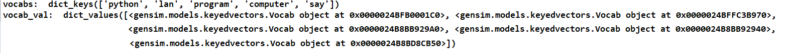 2) model.wv.vocab: key-value형식 ‘단어:벡터화 객체’로 dict타입 반환