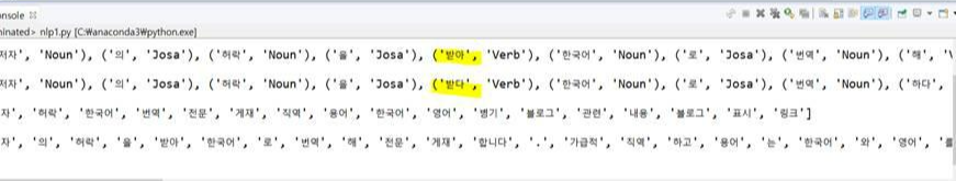 #품사 태깅 - 모든 단어들의 각각의 종류를 보여줌 ('저자', 'Noun'), ('의', 'Josa'), ('허락', 'Noun'), ('을', 'Josa'),.....
