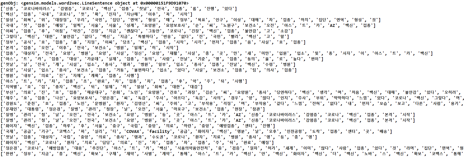 print(genObj) # <gensim.models.word2vec.LineSentence object at 0x0000022C7C734250>