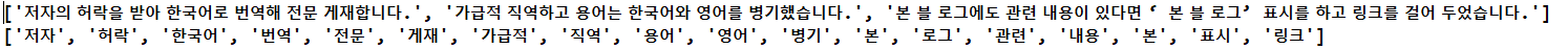 print(Kkma.sentences("저자의 허락을 받아 한국어로 번역해 전문 게재합니다. 가급적 직역하고 용어는 한국어와 영어를 병기했습니다. 본 블로그에도 관련 내용이 있다면 ‘본 블로그’ 표시를 하고 링크를 걸어두었습니다."))
