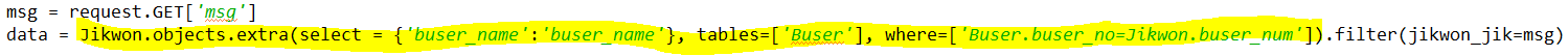 ii. 형식: 테이블명1.objects.extra(tables = 리스트타입, select = dict타입, where = 리스트 타입)