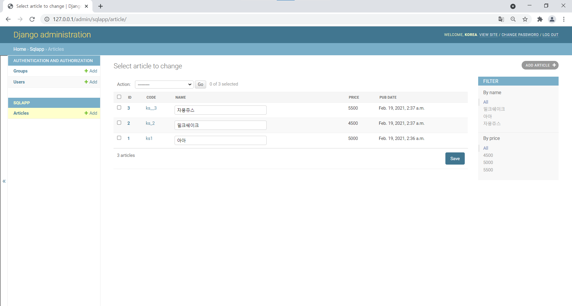 ③ list_editable : 목록 상에서 수정할 필드 목록