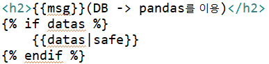 (3) views.py에서 DataFrame을 to_html()로 넘겼을 때는 {{변수명|safe}}로 받아야 한다. 아니면 태그들이 전부 문자열로 출력됨