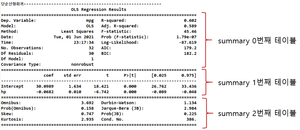 5) 모델.summary(): 모델의 통계정보들 표로 반환
