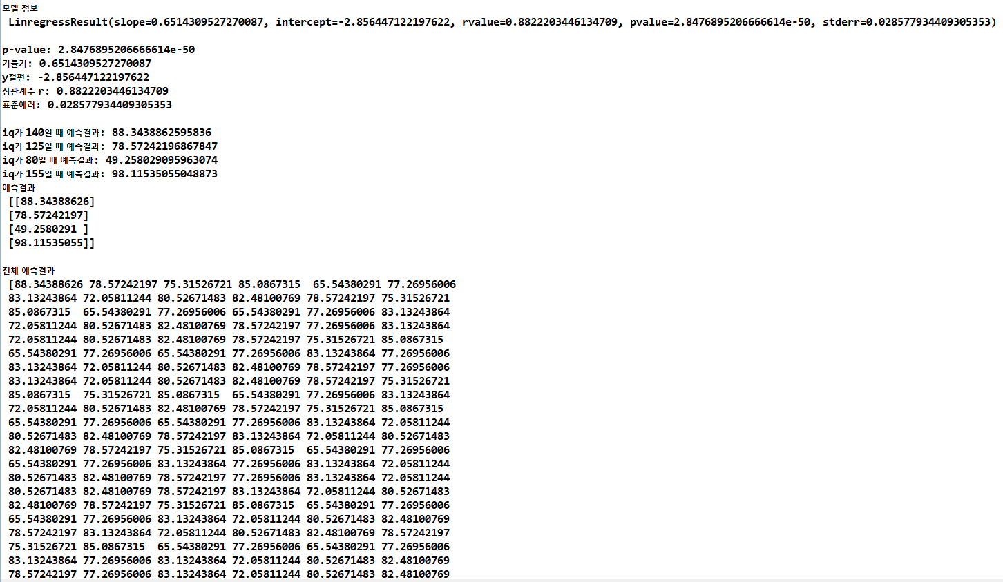 print('iq가 80일 때 예측결과:', model.slope * 80 + model.intercept)